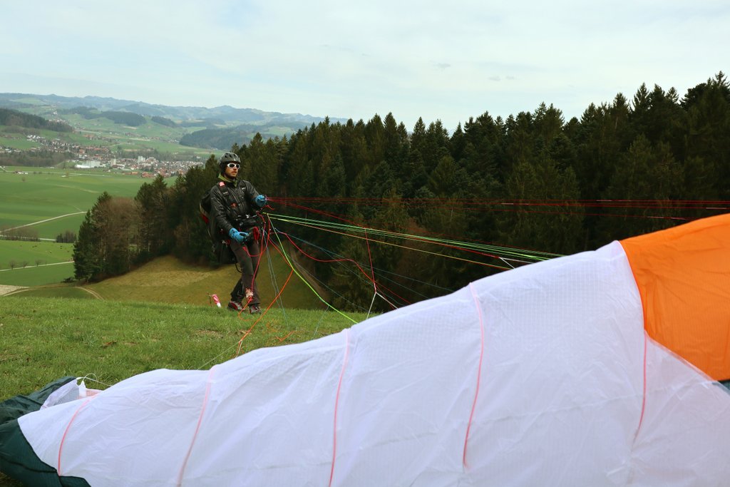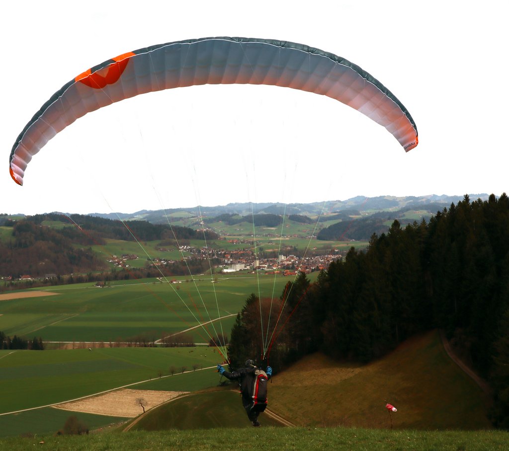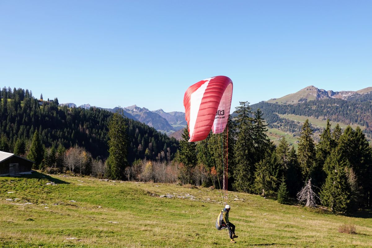 Schon während des Morgenkaffees strahlte der Himmel und war voller Schulschirme. Chrigel und Gonzo wollten auf thermisch optimale Bedingungen warten und verbrachten den Morgen auf dem Campingplatz. Zwei weniger ambitionierte Iisvögel leisteten sich den 6 € billigen Shuttle und genossen schon mal einen ruhigen Morgenflug vom Hausberg Chalvet. Gegen Mittag waren wir alle vier (erneut) am Startplatz – zusammen mit gefühlt 40 weiteren Piloten. Alle warteten auf den ersten Vorflieger, der sich halten konnte. Als es soweit war, brach Hektik aus und etwas ungemütlich starteten reihenweise Piloten auf der riesigen Startfläche. Chrigel und Gonzo flogen lange, überhöhten prächtig und schafften dann auch tatsächlich eine hübsche Strecke Richtung Norden. Zurück kamen sie per Autostopp.