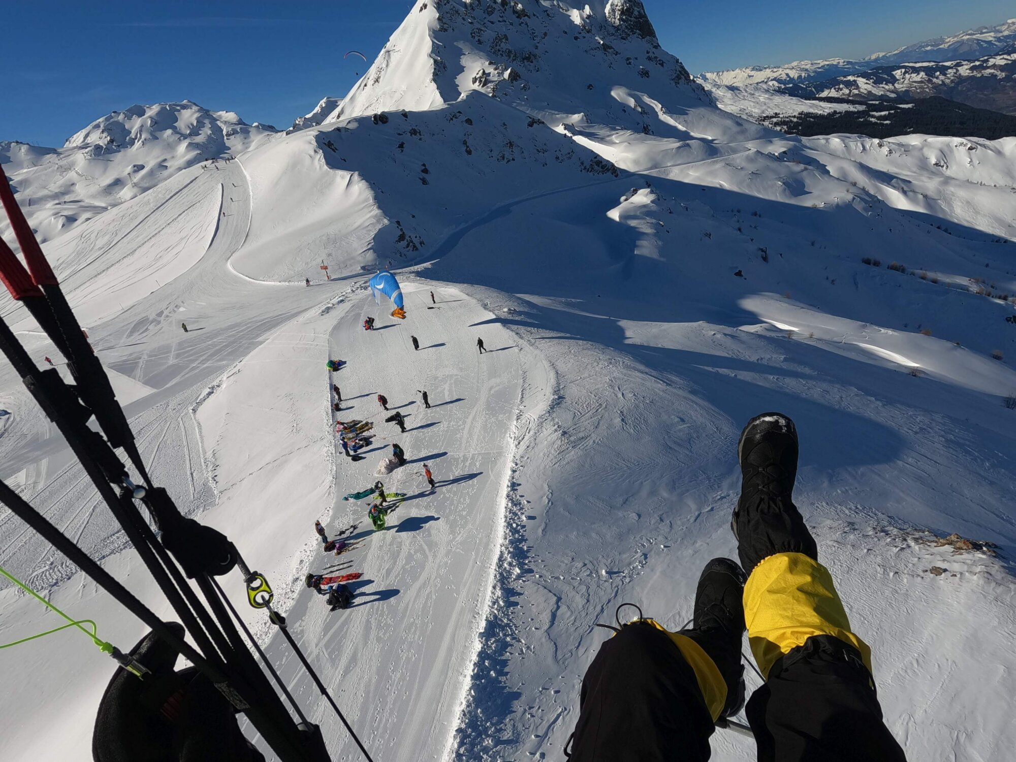 Ich wollte später noch Skifahren, darum begab ich mich gleich zum Start. Nach einigem Hin und Her entschied ich mich trotz zügigem Wind für einen Rückwärts-Skistart. Mögliche Helfer waren ja genug am Start. Alles passte und dank des Windes lag noch eine gute Viertelstunde seidenfeines Soaring an der Startkante drin, bevor etwas viele Schirme in der Luft waren und ich mich in die Talquerung für den Touch&Go einfädelte.
